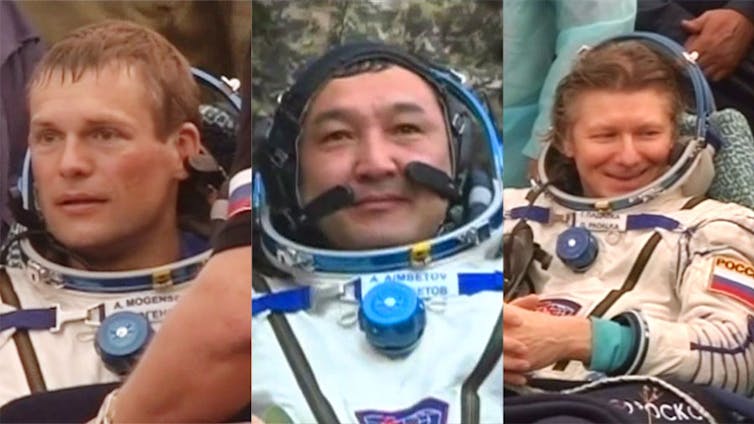 Andreas Mogensen, Aidyn Aimbetov and Gennady Padalka rest outside their spacecraft and are surrounded by support personnel after landing. NASA